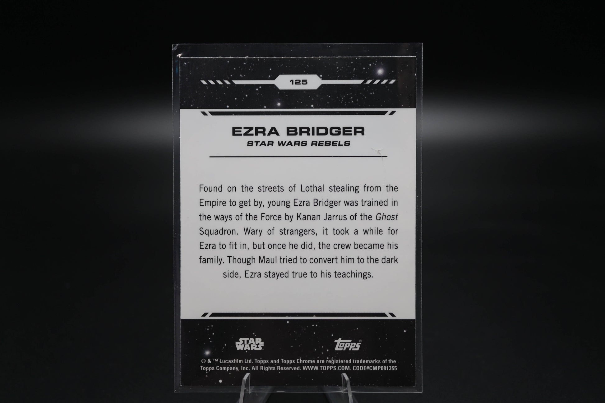 Ezra Bridger steps out of the shadows with this stunning 2024 Topps Chrome Star Wars card! Featuring the young Jedi rebel in all his glory, this #125 card showcases the premium chrome technology that makes Topps Chrome a collector favorite. With vibrant colors and that signature reflective finish, it's a must-have for Star Wars enthusiasts and serious card collectors alike. Whether you're building your collection or hunting for that perfect addition to your display, this Ezra card brings the Force to your lineup!